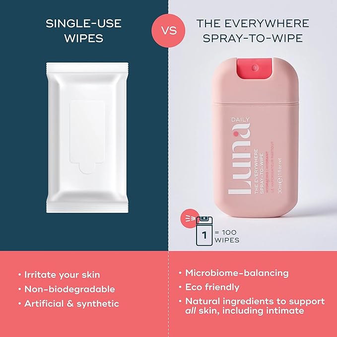 - INSTANT ECO-FRIENDLY WIPES: Spray directly onto skin or onto a tissue to create an instant eco-friendly, compostable, and flushable wipe. Use on intimate areas and all over the body. Flush or recycle tissue.