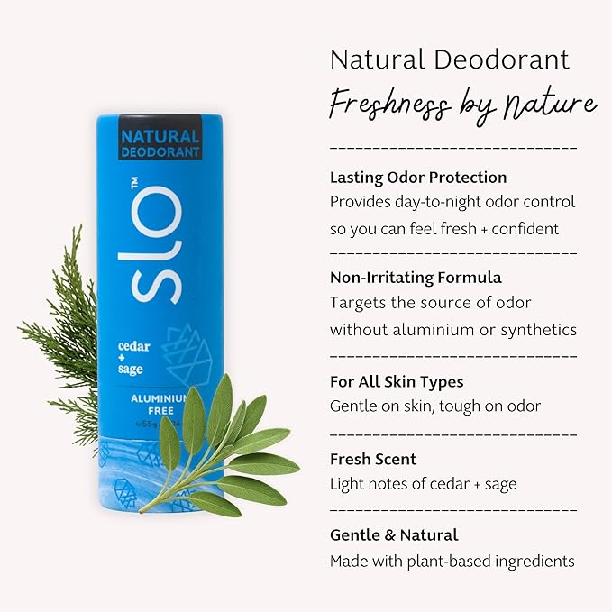 Slo | Natural Deodorant - All Natural Ingredients, Vegan & Cruelty Free, Compostable Packaging | Cedar + Sage, (1.94oz/55g)
