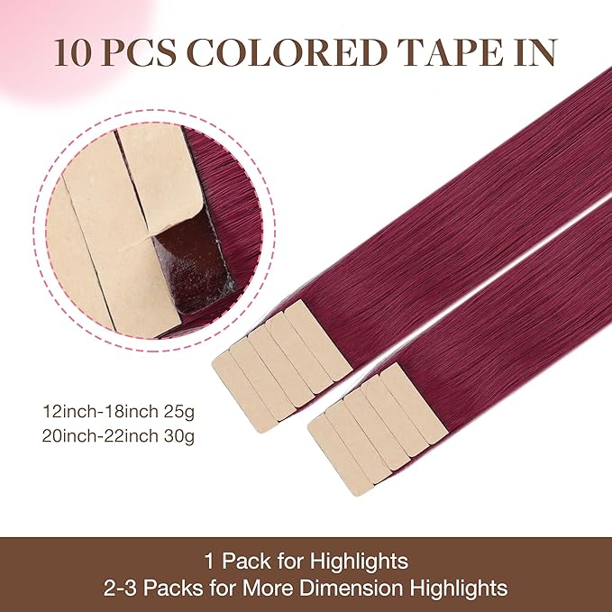 - Colored Tape-In Hair Extensions: Each 1.5" wide, 10-piece tape-in comes in 14"-22" and 25g-30g. Use 1 pack for highlights or 2-3 packs for full coverage. For extra volume, opt for 50g tape-ins, 2-3 packs. Expect slight color loss; wash gently and air dry