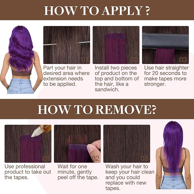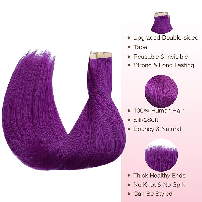 GOO GOO Tape in Hair Extensions Human Hair, Purple, 18inch 25g 10pcs, Colored Tape ins Human Hair Extensions, Silky&Soft Invisible Tape Ins, Hair Highlighted for Party