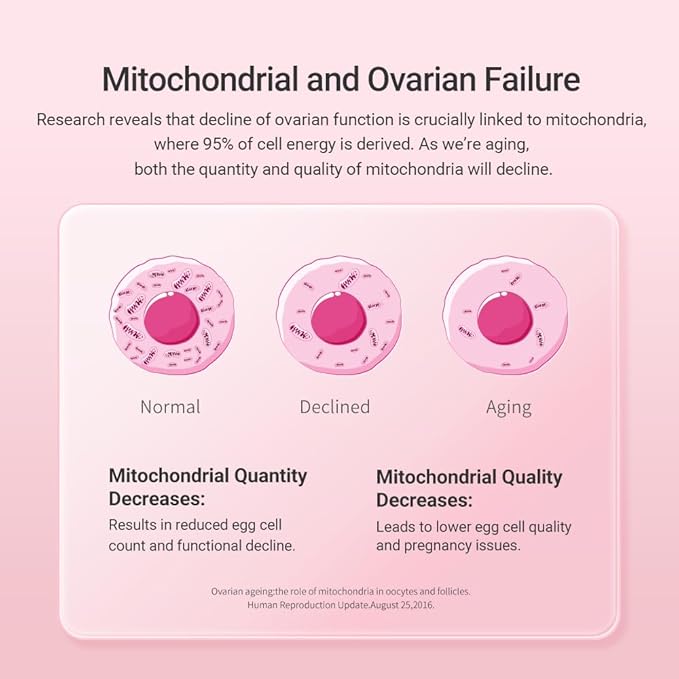 - 【Replenish Mitochondrial】 : Research reveals that decline of ovarian function is crucially linked to mitochondria,As we're aging, both the quantity and quality of mitochondria declines, the former results in reduced egg cell count and functional decline, the latter leads to lower egg cell quality and pregnancy issues