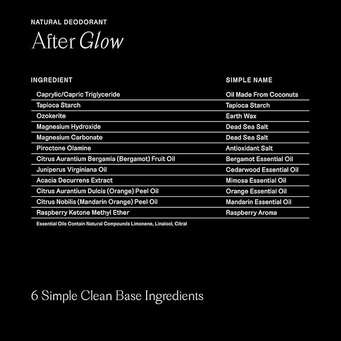 - After Glow: This scent reminds us life is delicious, and full of golden hour walks. Designed for sensitive skin, its natural ingredients promise to keep you fresh through your daily routine and beyond. This deodorant without aluminum not only surprises but truly delights the senses, making every moment a fragrant, skin-friendly experience that supports your wellness journey.