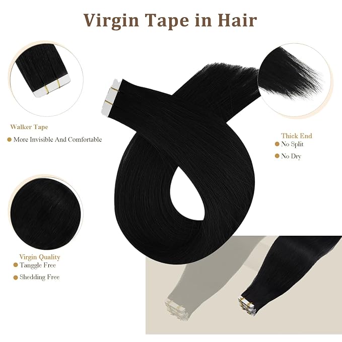 Full Shine Virgin Tape in Hair Extensions Color 1 Jet Black Tapes Extensions 14 Inch Remy Hair Extensions Tape in 25 Gram Double Sided Tapes Hair Extension 10 Pcs Long Lasting for Women