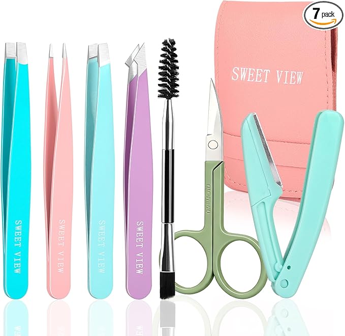 7pcs Eyebrow Tweezers Kit for Women Precision Plucker with Brow Scissors & Razor & Spoolie for Facial, Chin, Brow, Splinter and Ingrown Hair