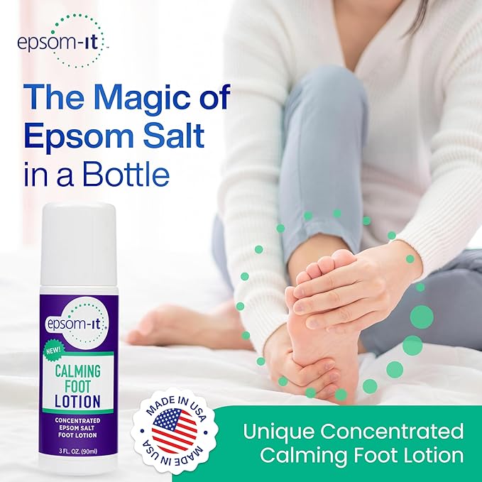 - Magnesium Roll On - Epsom-It’s rollerball makes applying the Epsom Salt lotion for feet super easy! Pop the foot rub on your nightstand or slip into your carry-on during travel and roll on affected areas as needed.