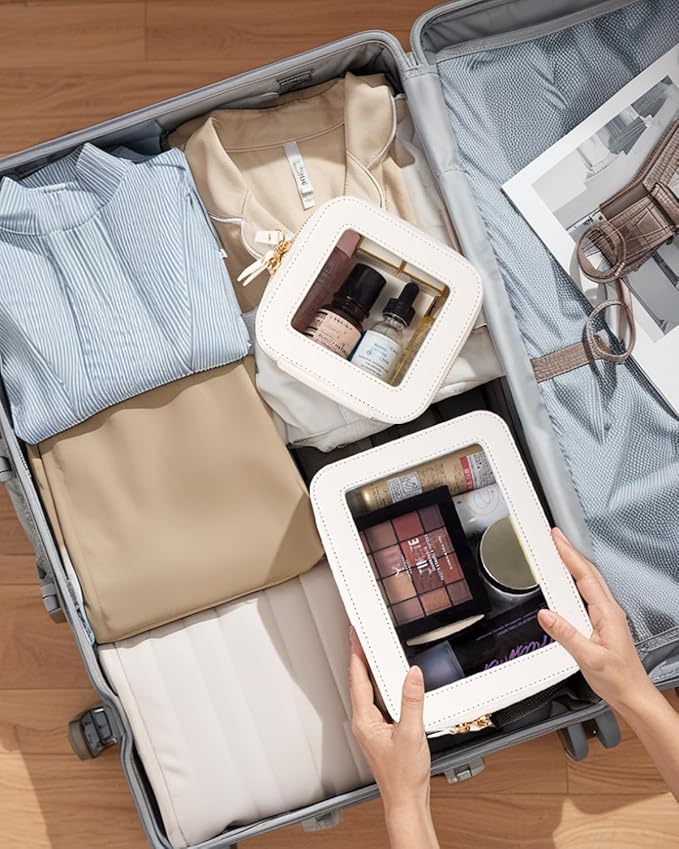 - Clear Design: Our 2Pcs Travel Makeup Bag is elegant ,and stylish, this makeup travel organizer was designed in a minimalist boxy shape,is sleek and minimalistic look for your makeup accessories collection. And is designed with a transparent PVC window,all items are clear at a glance, and you can quickly choose the cosmetics you need.Portable and lightweight Slip it into your purse, backpack, everyday tote or travelling bag for easy access to your must-have items. Large Size:8.1'' x 6.1'' x2.5'', Mini Size:5.1'' x 4.8''x 2''.