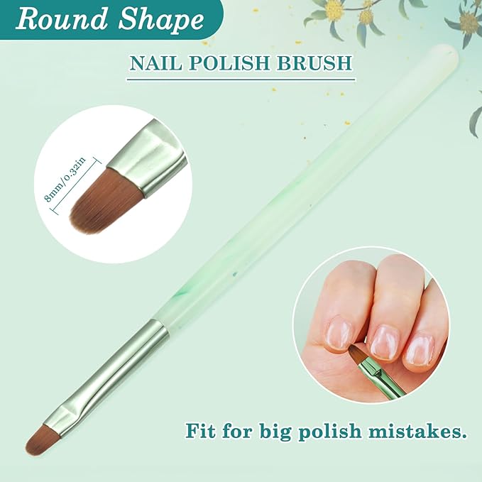 - RESILIENT TO NAIL POLISH REMOVER: This exceptional brush is crafted with synthetic bristles, ensuring cruelty-free usage. Featuring an elegant green handle, this brush combines style with functionality. Unlike conventional metal-handled brushes that succumb to acetone, the durable acrylic handle of this indispensable tool withstands exposure to nail polish remover, ensuring longevity and reliability through repeated use