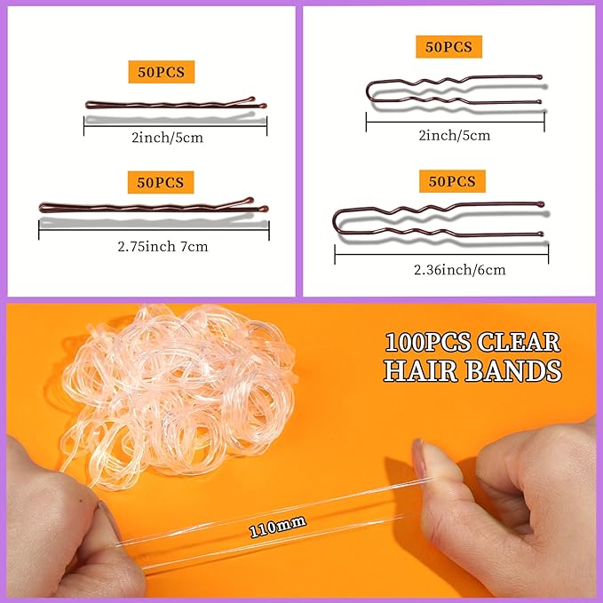 - Brown Bobby Pins and Bun Bobby Pins Set: Come with bobby pins brown hair and u shape bobby pins and hair bands, 3 diffrent hair accessories in one package. 50* 2'' bobby pins +50* 2.75'' large bobby pins +50* 2'' bun bobby pins+ 50* 2.36'' hair pins +100* clear hair bands. Meet almost all needs for hair styles