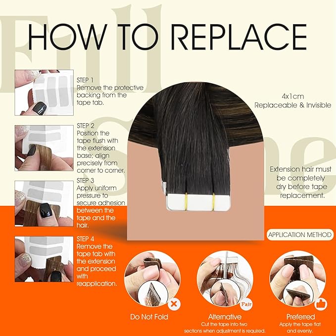 - Easy to Apply: Tape in hair extensions are designed for a streamlined application; When using the sandwich method, align both pieces, avoid excessive heat on the tape; Do not overload hair between sections; Pre-taped strips allow faster application