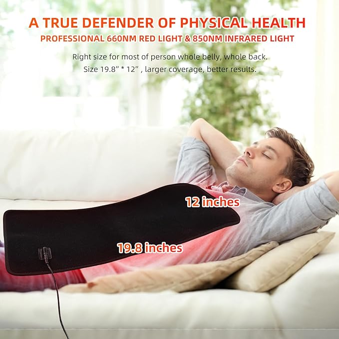 - Professional red & infrared light therapy: Larger 19.8" x12" red light therapy can repair our skin tissues and work on the body. 660nm red light(Visible) can work on our skin and achieve enhanced blood circulation, muscle relaxation, improved appearance problems of our skin. 850nm infrared light(Invisible) penetrates deeper into your bones, organs, and joints to relieve pain, speed healing, eliminate inflammation, etc
