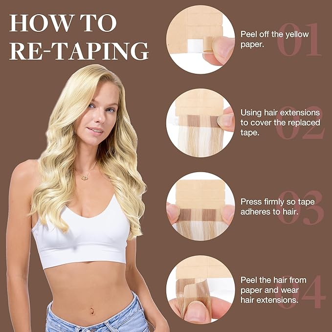 - Strong & Gentle Tape: Waterproof, hypoallergenic tape that's gentle on hair and skin. Strengthens with slight heat for a secure fit. Lasts 4–6 weeks per use. Easy to apply and remove without damage. Reusable for 3–4 months with proper care.