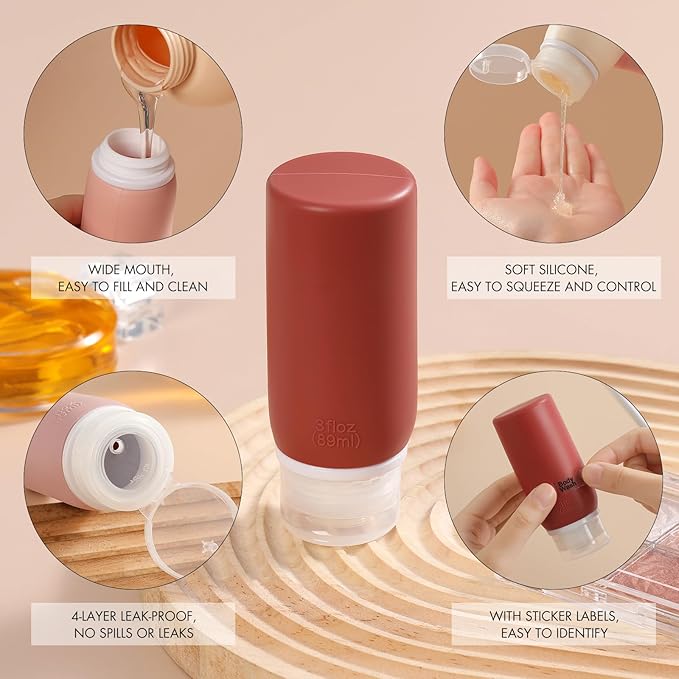 - ✈️【Upgraded 4-Layer Leak-Proof Design】: With latest anti-leakage design, each silicone bottle includes a convenient flip cap with 4-layer leak-proof and a drip free dispenser valve to protect your personal belongings from leaks, spills or drops. Perfect containers for shampoo, body wash, hand sanitizer, moisturizer, perfume, essential oils.