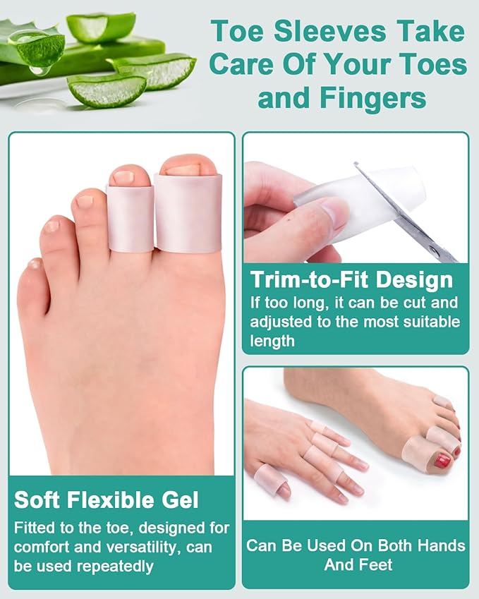 - Gel Toe Protectors: This set includes 16 silicone toe sleeves designed to provide relief for various toe issues like corns, calluses, bunions, hammer toes, ingrown toenails, and toenail loss