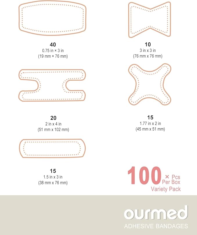 - Family Variety Packs for Joints: Ourmed Bandage variety pack contains 100 various shapes bandages snuging on your knuckle, knee, feet and fingertip. Each wound can receive precise and comprehensive protection.