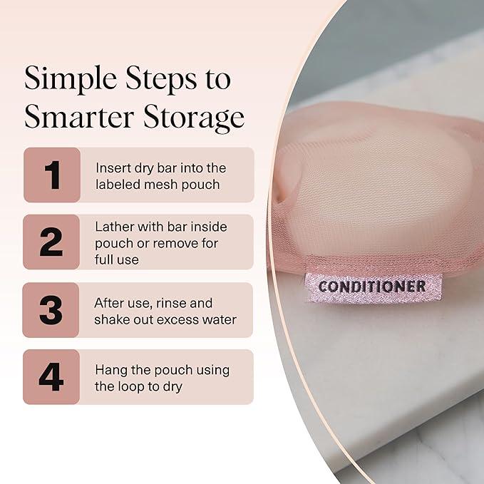 - REDUCE PLASTIC WASTE WITH BOTTLE-FREE BEAUTY – Replace single-use bottles with our sustainable soap saver bag and bar soap holder for shower. Perfect for body wash bars, shampoo bars, and conditioner bars, this eco-friendly option helps reduce plastic waste while keeping your routine stylish and efficient.