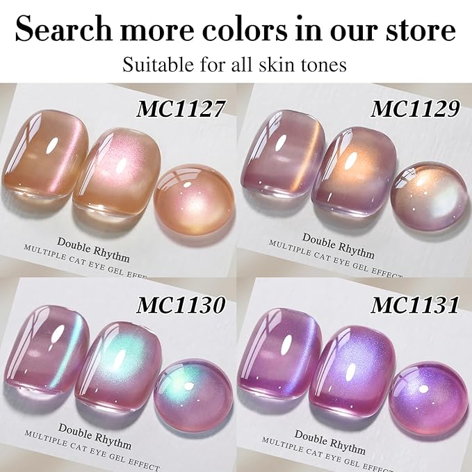 - Cat Eye Gel Nail Polish : Double Rhythm cat eye gel nail polish kit includes 1 color 15ml / 0.5 fl.oz gel nail polish. The cat eye gel can be combined with different bacse colors arbitrarily, you can get different colors nail art.You can use different base coat to creat different sytles.