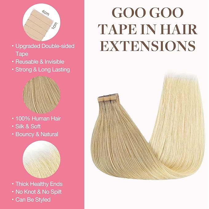 - Heat-Styling & Care Tips: GOO GOO tape in extensions are heat-safe up to 250°F. Curl or straighten as desired. Wash gently with mild shampoo in lukewarm water, then air dry. Keep them smooth, shiny, and ready for any look.