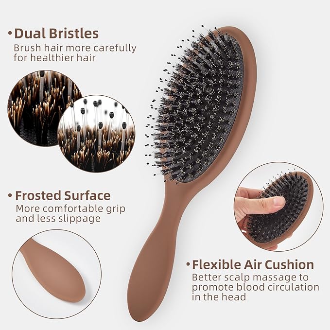 - "【Gentle Detangling】Boar bristle hair brushes glide smoothly through hair tangles and knots without tearing or pulling hair,minimizing pain,split ends and breaks,and effectively preventing static electricity.Gives you a comfortable combing and scalp massage process"