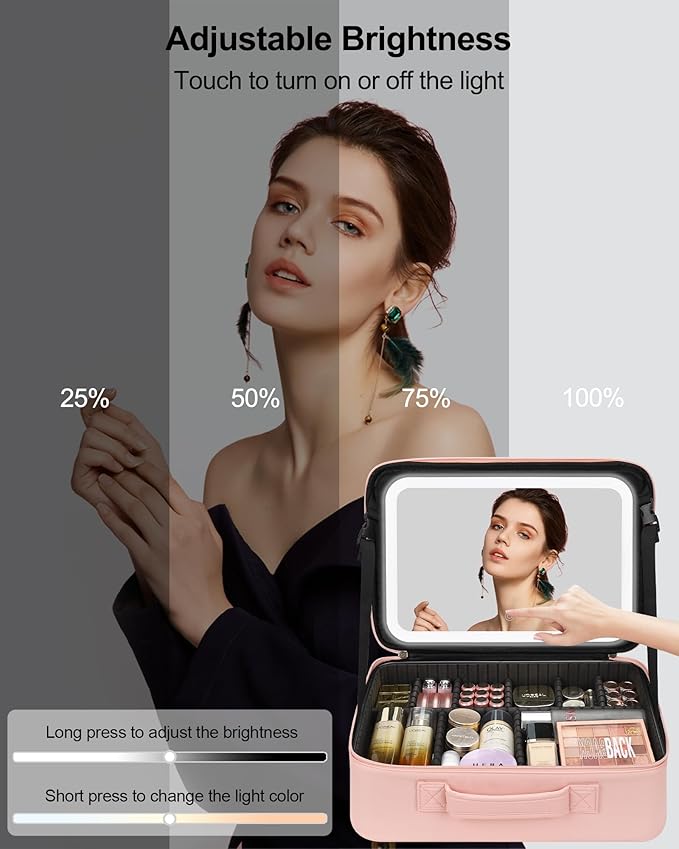 - PROFESSIONAL MAKEUP BAG WITH LED MIRROR: Travel cosmetic bag with a rechargeable lighted makeup mirror, it has 3 Color Lighting Modes (Cold Light, Natural Light, and Warm Light) & Brightness Adjustment, adaptable to different environments and make-up needs. Gentle press the sensor switch to change the color of the light, and long press to adjust the brightness of the light.