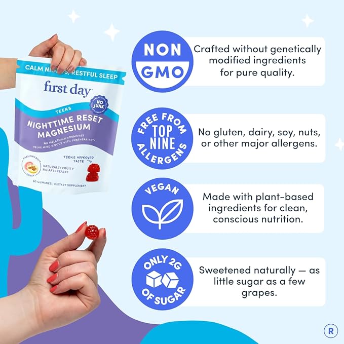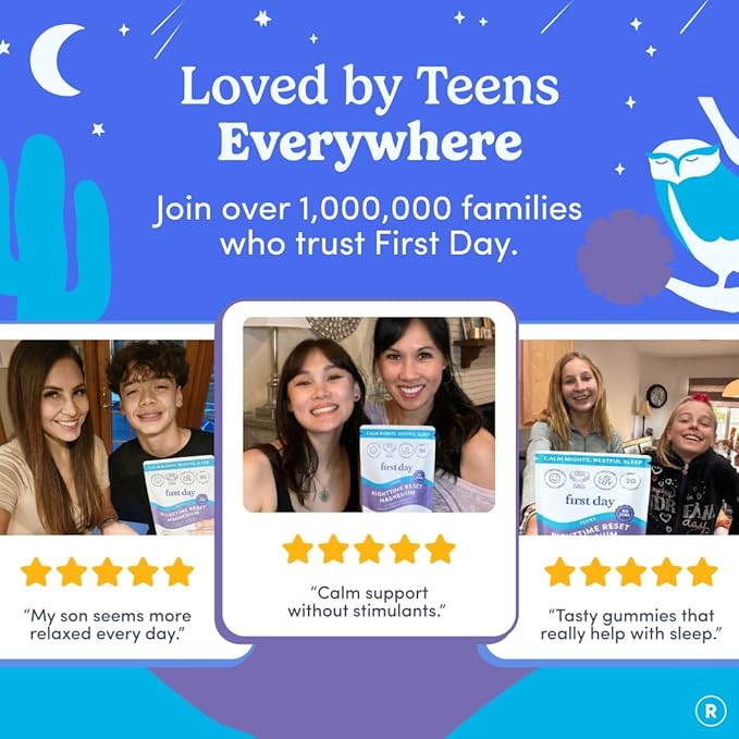 First Day Teens’ Nighttime Reset Calming Magnesium Gummies – Sleep Aid Supports Peaceful Rest, Balanced Mood & Energy – Supplement with Magnesium Citrate, Affron & No Melatonin – 30-Day Supply