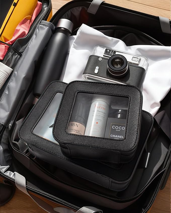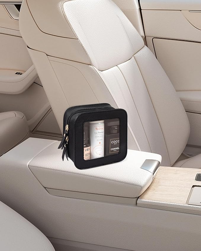 - Roomy and Stylish:Measuring Standard Size 9.25'' x 6.1'' x 2.75''(23.5cm x15.5cm x 7cm), Mini Size :5'' x 4.7'' x 2''(12.7cm x 12cm x 5cm)our clear makeup bag is elegant ,and stylish, this makeup travel organizer was designed in a minimalist boxy shape and Crafted in beautiful PU leather and finished with polished hardware, the trendy makeup bag is easy to carrying in your handbag or carry-on.