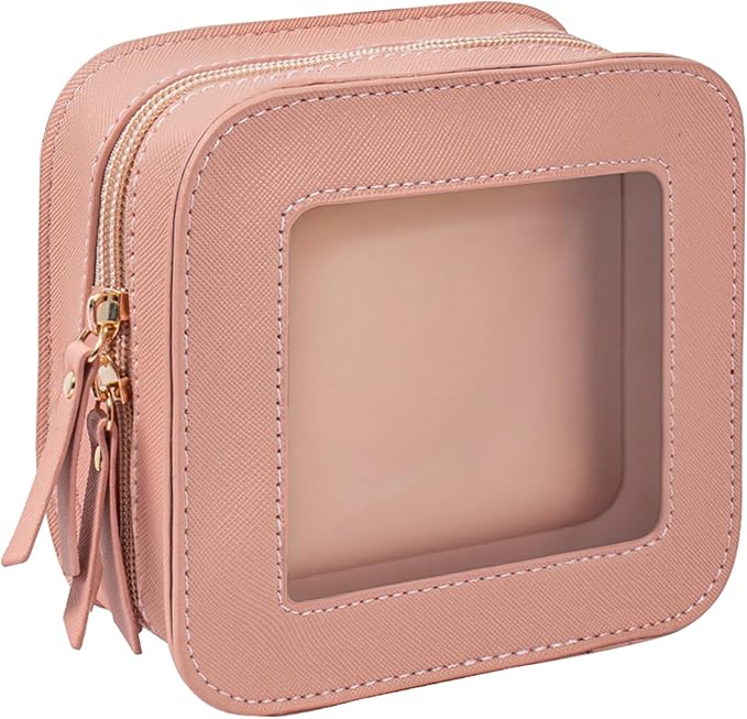 - Roomy and Stylish:Measuring Standard Size 9.25'' x 6.1'' x 2.75''(23.5cm x15.5cm x 7cm), Mini Size :5'' x 4.7'' x 2''(12.7cm x 12cm x 5cm)our clear makeup bag is elegant ,and stylish, this makeup travel organizer was designed in a minimalist boxy shape and Crafted in beautiful PU leather and finished with polished hardware, the trendy makeup bag is easy to carrying in your handbag or carry-on.