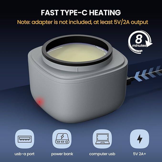 - Rapid Type-C Heating: Achieve full melt in just 8 minutes with 10g of crafting wax beans, thanks to the efficient Type-C USB system compatible with computers, power banks, and wall outlets (adapter not included)
