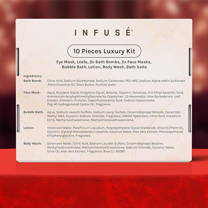 - COMPLETE SPA ESSENTIALS: Spoil her with this 10-piece spa gift box, packed with essentials like body wash, bubble bath, a cozy eye mask, exfoliating loofah, two bath bombs, bath salt, hydrating lotion, and two rejuvenating face masks. This box delivers a pampering treat she’ll treasure. It’s a heartfelt gift for women who deserve a moment of relaxation. Whether it's for mom, wife, or a dear friend, this set is designed to elevate her self-care routine and bring a touch of luxury into her life.