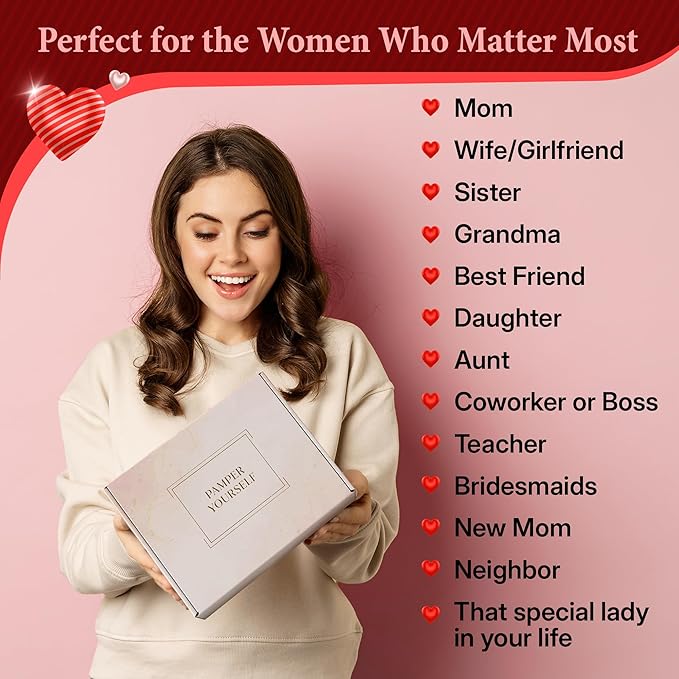 - PERFECT GIFT FOR EVERY OCCASION: Thoughtfully curated for every special moment, this spa gift box celebrates moms, grandmas, mother-in-laws, wives, sisters, teachers & best friends. Making it perfect for birthdays, mother's day, valentines, anniversaries or "just because." Offering a unique & versatile way to show appreciation. From a busy professional to a friend needing a boost, this set is a top gifts choice for women, mothers, and loved ones. It’s a delightful way to make her feel cherished.