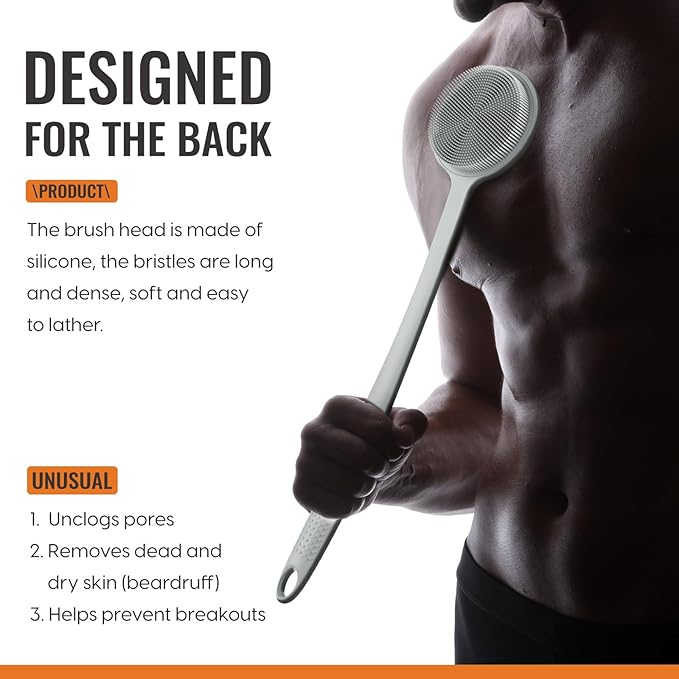 - 17” Extra-Long Handle: Silicone Back Scrubber for Shower, extra-long handle design, can reach anywhere you want to wash, the handle has a non-slip point design, and there is a hanging hole for easy hanging