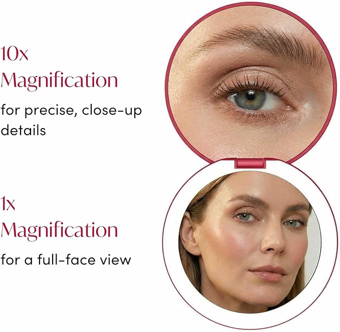 - Double-sided magnification (1x and 10x) so you can apply a full face of makeup, do a quick touch-up on the go, or focus on a detailed task like tweezing or inserting contact lenses