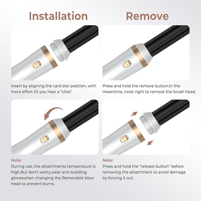 - Safety Air Curler:Our hot air brush styler and dryer plug have standard US ALCI Safety Plug Auto Leakage Protection. During use auto wrap curler, the handle temperature is high, please don’t worry, we have undergone numerous high-temperature experiments and have safety and explosion-proof properties. At the same time, Wear anti-scalding gloves when changing the air curler removable blow head to prevent burns.