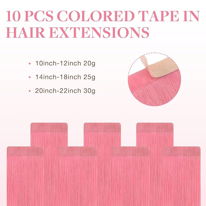 - Colored Tape-In Hair Extensions: Each 1.5" wide, 10-piece tape-in comes in 14"-22" and 25g-30g. Use 1 pack for highlights or 2-3 packs for full coverage. For extra volume, opt for 50g tape-ins, 2-11 packs. Expect slight color loss; wash gently and air dry