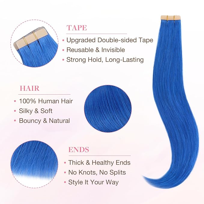 GOO GOO Tape in Hair Extensions Human Hair, Blue, 12inch 20g 10pcs, Colored Tape ins Human Hair Extensions, Silky&Soft Invisible Tape Ins, Hair Highlighted for Party