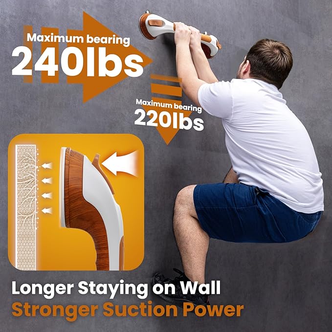 - Easy for Installation: Each suction cup shower handle equips 2 Strong suction cups with locking latches to provide stable protection. The bathtub hand rail ONLY needs to pull down the latches with 5 seconds and the installation is done, quickly and effortlessly! NO drilling, NO screws, NO glue and NO tools are required, fully removable, reusable and causing no damage to your wall