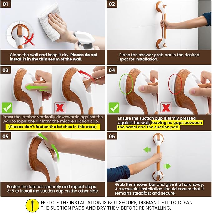- Matters need Attention: Only suitable for tiles measuring 4×4 inches or larger. For the safety of the seniors and elderly, please pay attention that the suction grab bars for shower ONLY sticks on smooth and non-porous AIRTIGHT walls which are NOT air-permeable like metal, glass, tile, marble, stainless steel and acrylic but does NOT apply on uneven tile, unfinished marble, wallpaper, dry wall, porous wall, painted wall,etc. Please don't put all the body on the shower grip
