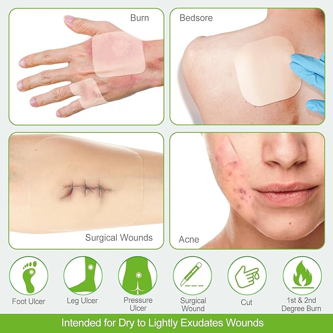 - ✅Idea for the dry to lightly exudates pressure ulcer, leg ulcer, diabetic ulcer, surgical wound, donor site, minor burn, abrasion, cuts, acne dot, laceration wound.