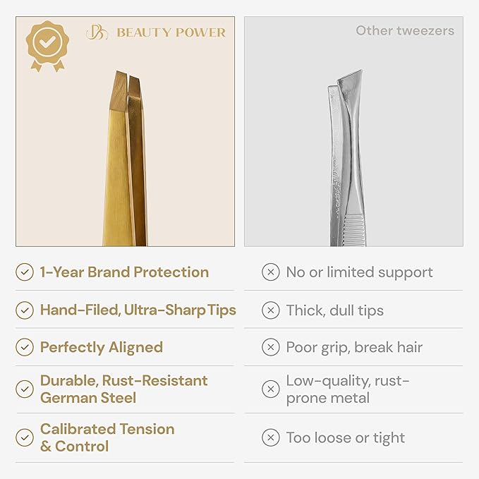 - PREMIUM GERMAN STAINLESS STEEL: Built from high-quality German stainless steel for exceptional strength and longevity. These tweezers resist rust, corrosion, and wear, retaining their sharp grip over time. Whether used daily or occasionally, they maintain performance and precision, making them the go-to choice for beauty professionals and home users alike.