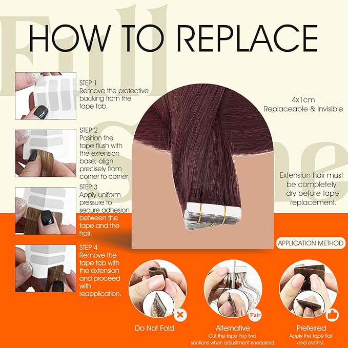- Easy to Apply: Tape in hair extensions are designed for a streamlined application; When using the sandwich method, align both pieces, avoid excessive heat on the tape; Do not overload hair between sections; Pre-taped strips allow faster application