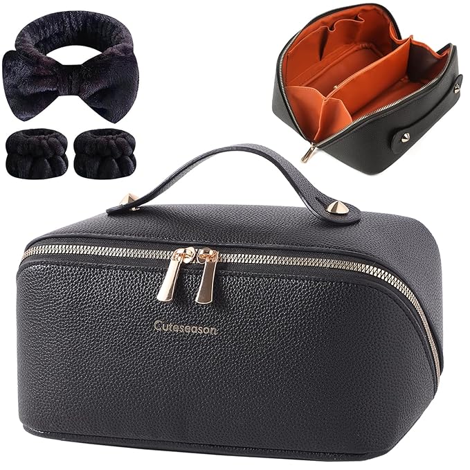 Makeup Bag, Travel Toiletry Bag for Women, Large Capacity Waterproof PU Leather Cosmetic Bags Make Up Organizer Bags with Headband and Wristband Set (Black, Lychee Pattern)