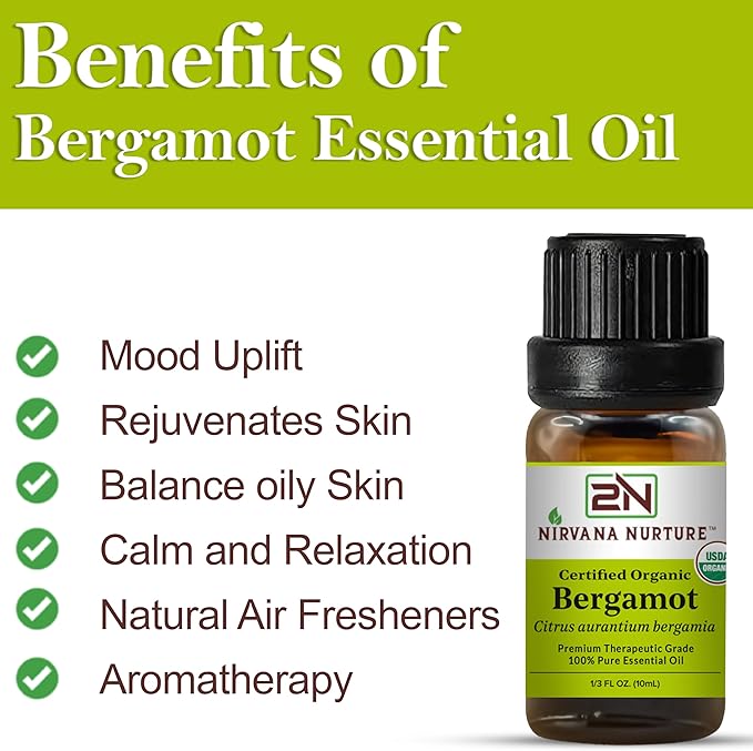 - SKIN REJUVENATION: Nirvana Nurture Bergamot essential oil helps balance oily and acne-prone skin, reducing breakouts and calming irritation and promotes a youthful rejuvenated skin. When diluting a few drops in a carrier oil before applying it.