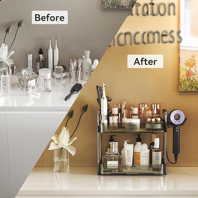 - 【Upgrade 3-in-1 Multifunctional Design】 Integrated with a dedicated hair dryer holder and toothbrush/shaver rack, this bathroom counter organizer transcends traditional storage. It’s a complete hair tool and grooming station that saves 80% of your countertop space while keeping essentials within arm's reach. Perfect as a skincare organizer or vanity storage solution.