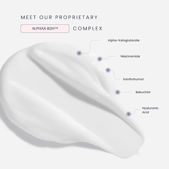 - PROPRIETARY ALPHAX-B2H COMPLEX - Features our exclusive blend of ALPHA-ketoglutarate (AKG), Xanthohumol, Bakuchiol, niacinamide (Vit B3), and Hyaluronic acid, each selected to support the appearance of collagen renewal and boost skin resilience. Nourishing oils like babassu and squalane deeply moisturize dry skin while soothing and restoring the skin barrier.