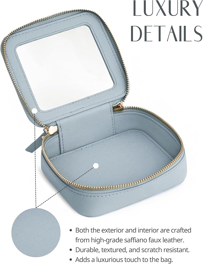 - [Mini but Mighty] – The blue mini makeup bag measures 5'' x 4.7'' x 2'' (12.7cm x 12cm x 5cm), perfect for holding daily mini essentials including lip balms, hair ties, jewelry, Air Pods, charging cords and medications. Slip it into your purse, backpack, everyday tote or travelling bag for easy access to your must-have items.
