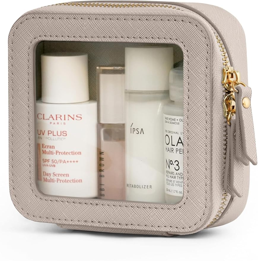 - [Premium Material and Durability] – The clear small cosmetic case, both the exterior and interior, is crafted from high-grade saffiano faux leather, which is highly scratch resistant, durable and exceptionally easy to keep clean. It features a smooth zipper for secure closure, and elegant light gold metal hardware accents, adding a luxurious and sophisticated touch to the bag's overall design.