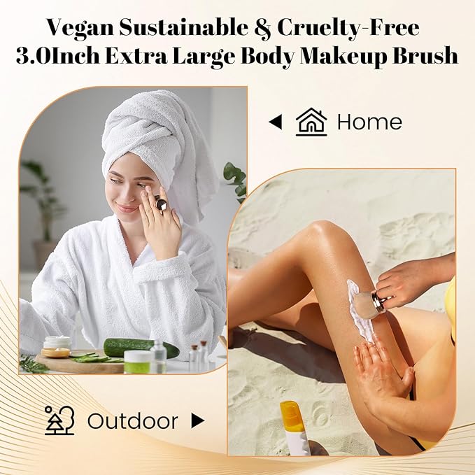 - VERSATILE USE: This large kabuki brush for body works as a face & body tanner brush, neck & chest self tan brush, leg makeup brush, arm concealer brush, and back body brush—adapting seamlessly to every area. As a body makeup brush, it’s perfect for applying tanning products, foundations, body glitter, highlighters, shimmering lotions, BB creams, loose powders, and concealers. This body tanning brush truly meets all your body makeup needs, with the flexibility to focus on every part from face to back.