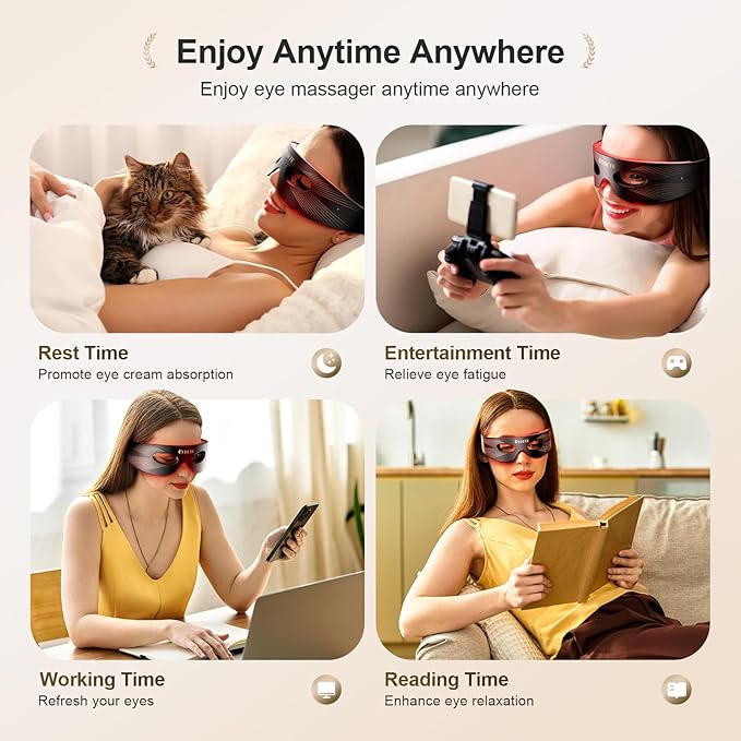 - 【Deep Light Technology】 Eye massager has LED lights of different colors, and light of different wavelengths can reach different depths of the skin, penetrate deep into the skin, and let dark circles and puffiness a thing of the past. The unique designed eye mask blocks light from entering your eyes, allowing you to multitask comfortably during your eyecare routine without straining your eyes.