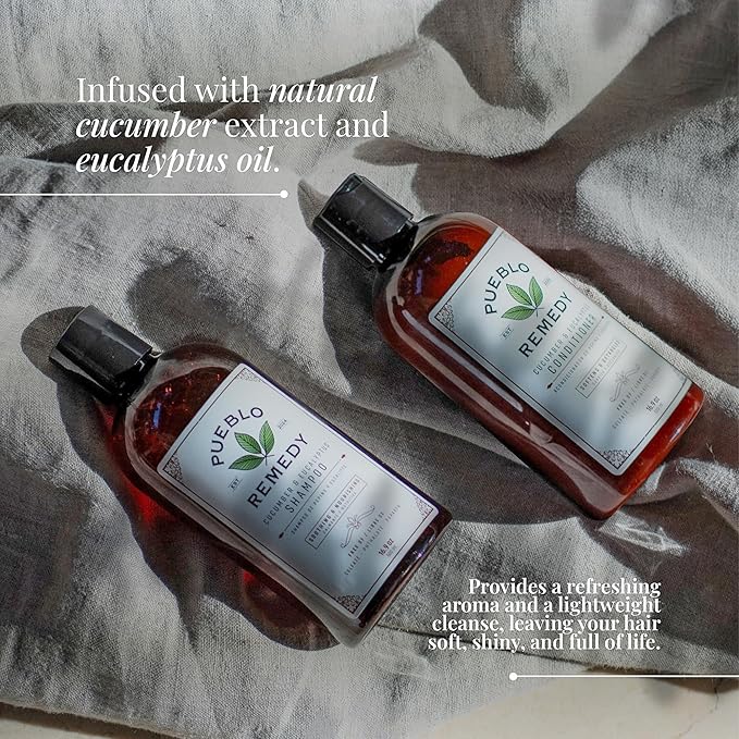 - SHOWER ESSENTIALS: Infused with soothing cucumber and revitalizing eucalyptus oil, this pH-balanced conditioner transforms every shower into a ritual of renewal. For best results, pair with the Pueblo Remedy Cucumber & Eucalyptus Shampoo.