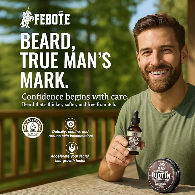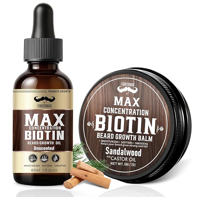 - [Beard Growth Support – For Fuller, Thicker Beard] This sandalwood beard balm and unscented beard oil set is infused with biotin, castor oil, and jojoba oil—key ingredients that help reduce patchiness and support the appearance of fuller, healthier-looking facial hair. Ideal for men growing a beard or improving thin spots.