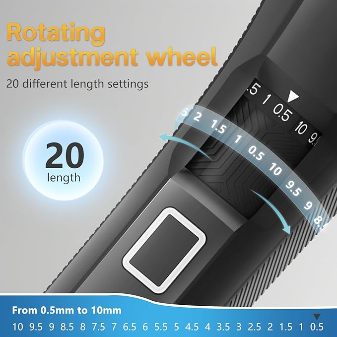 - Adjustable Beard Trimmer for Men : Our precision beard groomer with an intuitive zoom wheel with 20 precise length settings(0.5 mm increments up to 10 mm max. length) to choose, mustache trimmer can trim different lengths of beard, from stubble to short and clean to thick and even, so you can discard the multiple clipper attachments and can adjust the men's beard trimmer to your needs trim anything from a lumberjack-style mustache to stubble,enjoy 60 mins of cordless use after full charge